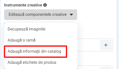 Procesul este asemanator cu cel descris anterior pentru adaugarea unei rame. Diferenta consta in selectarea optiunii ,,Adauga informatii din catalog” la nivelul sectiunii de ,,Instrumente Creative”. Ulterior, din fereastra care se deschide poti selecta ce informatii din catalog doresti sa adaugi pe produsele din reclamele afacerii tale.